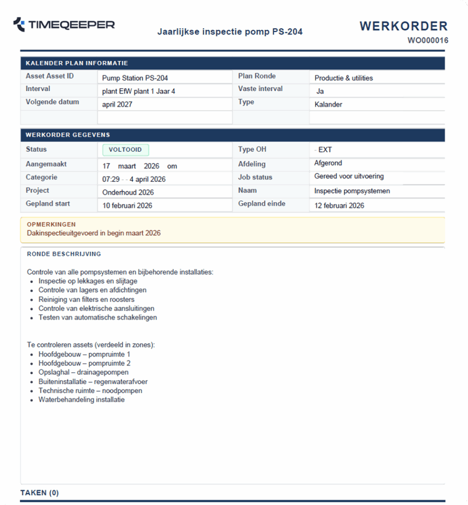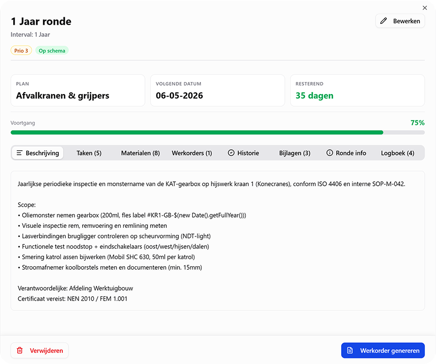 Create maintenance rounds based on running hours, calendar schedules — or a combination of both. Running hours are linked directly to sensors that register hours in real time, so the module always works with up-to-date data. No more manual tracking: the system knows exactly when maintenance is due.